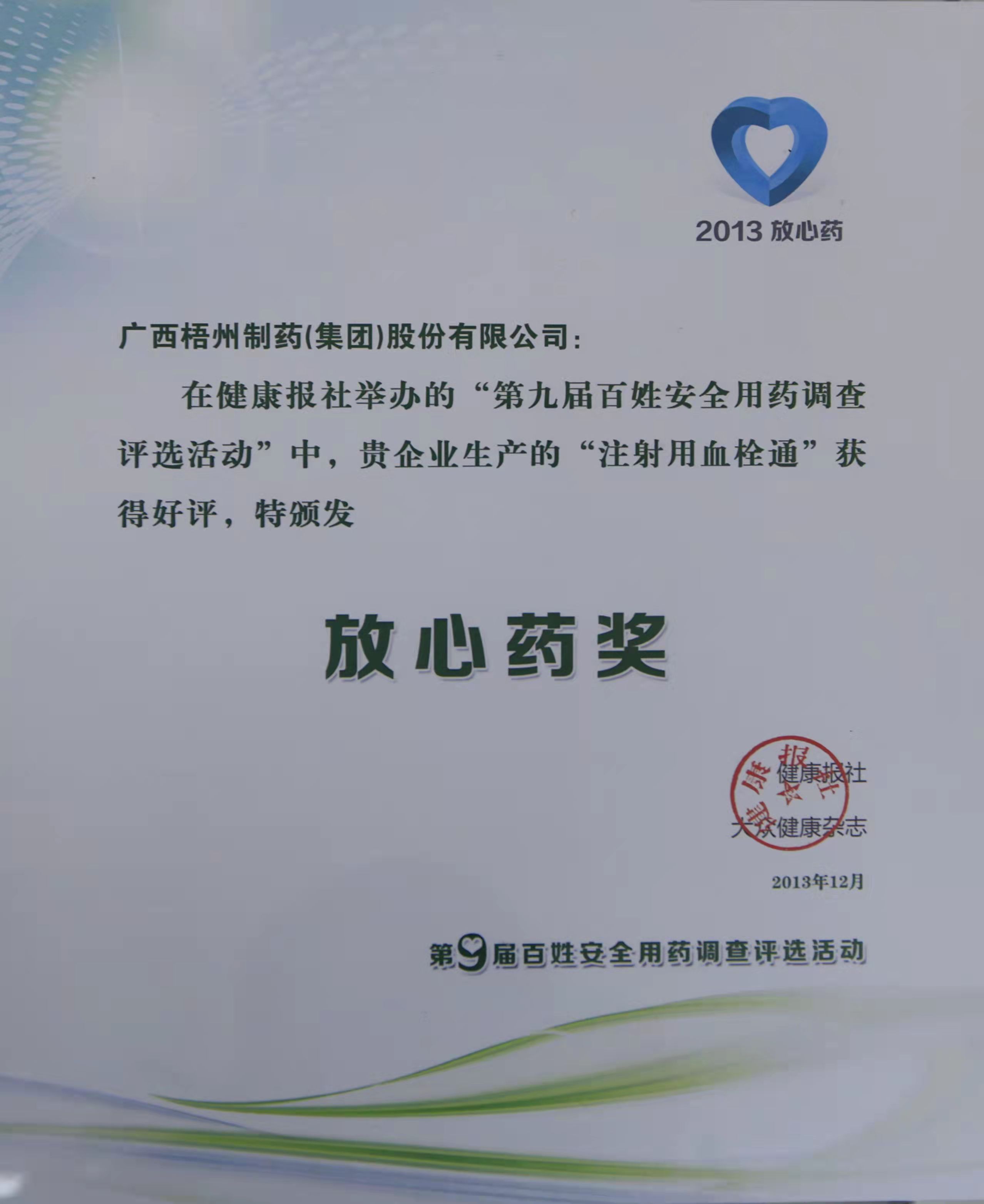 注射用血栓通榮獲第九屆百姓安全用藥調(diào)查評選活動“放心藥”獎