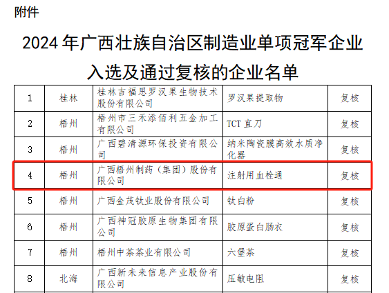 近日,廣西壯族自治區(qū)工業(yè)和信息化廳公布2024年廣西壯族自治區(qū)制造業(yè)單項(xiàng)冠軍企業(yè)名單,梧州制藥憑借著冠軍產(chǎn)品注射用血栓通卓越的技術(shù)能力和市場(chǎng)競(jìng)爭(zhēng)力,順利通過了每三年一次的復(fù)核評(píng)價(jià)。