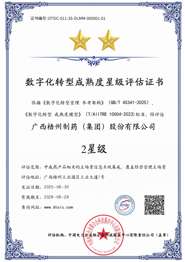 梧州制藥榮獲數(shù)字化轉型成熟度2星級認證
