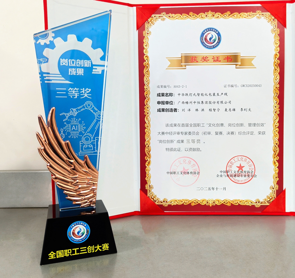 廣西梧州制藥(集團(tuán))股份有限公司中華跌打丸智能化包裝生產(chǎn)線榮獲“崗位創(chuàng)新“成果 三等獎(jiǎng)